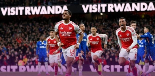 同一时间,酋长球场上演伦敦德比,阿森纳迎战切尔西。萨利巴第21分钟头球破门,阿森纳先拔头筹。上半场补时,切尔西詹姆斯角球制造乌龙,比分扳成1-1。下半场第66分钟,廷贝尔再靠角球头球建功,帮助阿森纳2-1领先。第70分钟,切尔西内托两黄变一红,少打一人苦苦支撑。最终阿森纳2-1击败十人切尔西,继续保持六轮不败,积64分稳居榜首,领先曼城5分。